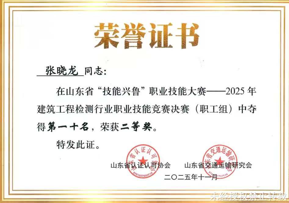 近日,2025年山東省“技能興魯”建筑工程檢測行業(yè)職業(yè)技能競賽落幕。山東交建集團(tuán)代表隊(duì)斬獲職工組團(tuán)體一等獎(jiǎng),1人榮獲個(gè)人一等獎(jiǎng),1人榮獲個(gè)人二等獎(jiǎng)。