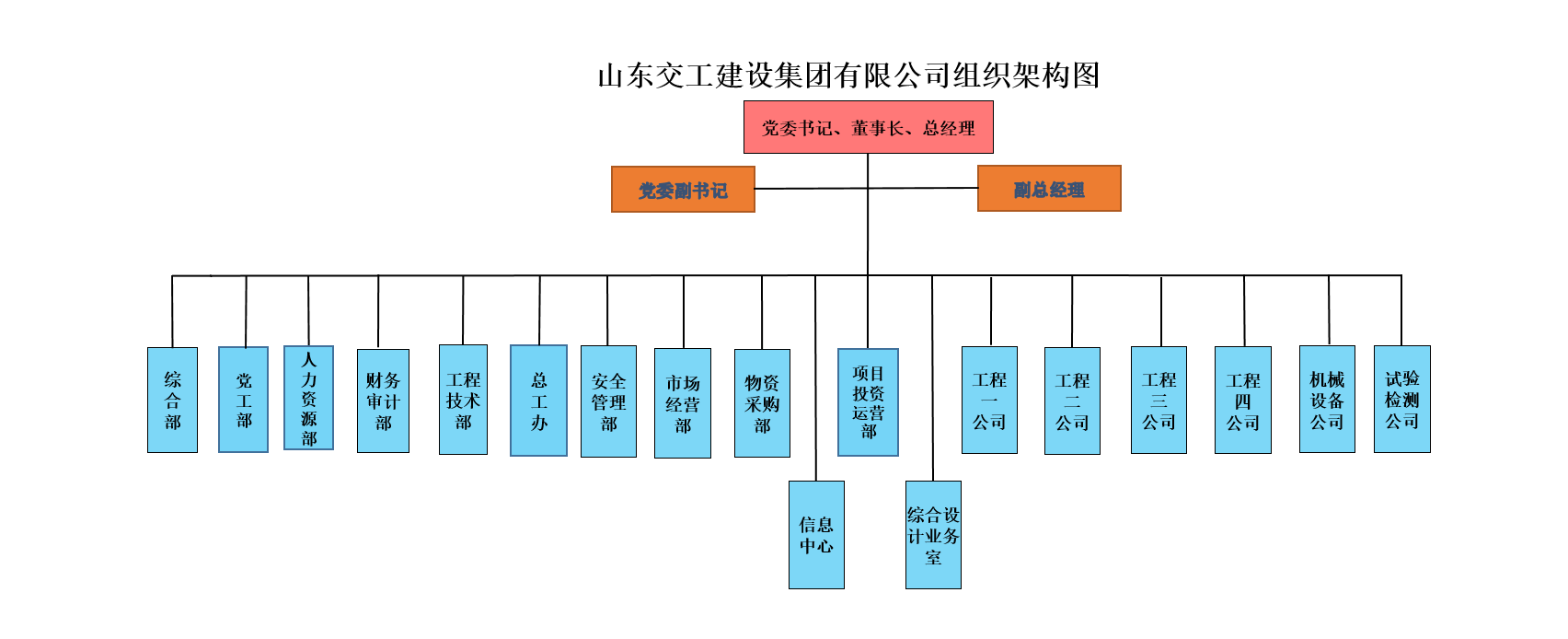經公司黨委會研究,報集團黨委審批,山東交工建設集團有限公司下設十二個部室:綜合部、財務審計部、人力資源部、工程技術部、總工辦、安全管理部、市場經營部、物資采購部、項目投資運營部、黨工部、信息中心、綜合設計業(yè)務室,六個分公司:工程一公司、工程二公司、工程三公司、工程四公司、機械設備公司、試驗檢測公司。