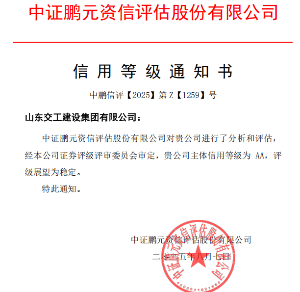 近日,山東交建集團(tuán)完成主體信用等級復(fù)評,經(jīng)國內(nèi)權(quán)威信用評級機(jī)構(gòu)——中證鵬元資信評估有限公司綜合分析和評估,維持公司“AA”主體信用等級,評級展望為“穩(wěn)定”。
